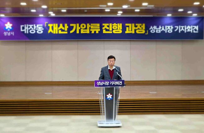 [TBA뉴스=김시창 기자] 성남시(시장 신상진)는 9일 오전 성남시청 한누리실에서 기자회견을 열고 대장동 범죄수익 환수를 위한 가압류 진행 상황을 공개했다. 신상진 성남시장은 대장동 개발 비리로 발생한 부당 수익을 반드시 시민들에게 돌려놓겠다며 단돈 1원이라도 끝까지 환수하겠다고 강조했다.