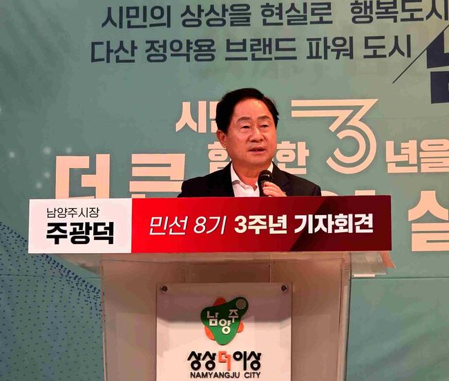 [TBA뉴스=김시창 기자] 민선 8기 출범 3주년을 맞이한 주광덕 남양주시장이 7월 21일 오전 10시 30분 시청 다산홀에서 기자회견을 열고 지난 3년간의 시정 운영 성과를 직접 설명했다. 특히 '산업생태계 대전환'을 선언하며 남양주의 미래 청사진을 제시해 기대감을 높였다.