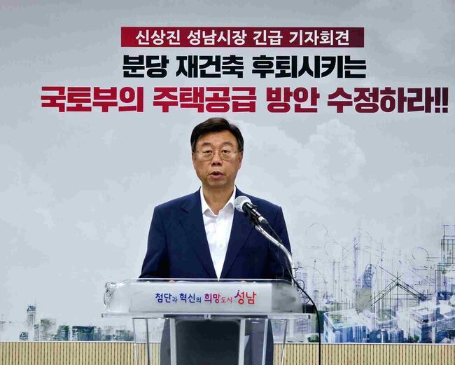 신 시장은 26일 성남시청에서 긴급 기자회견을 열고 국토부가 발표한 '1기 신도시 정비사업 후속 추진방안'을 강하게 규탄하며 수정할 것을 촉구했다.